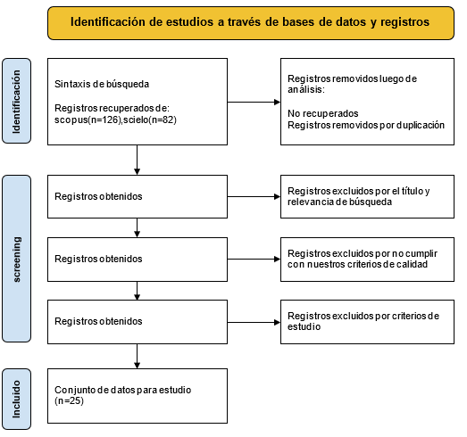 Procedemos con la elección de 25 artículos que según criterios de exclusión e inclusión, además de nosotros haberlos considerado los más representativos en el tema de estudio, serán estudiados a más detalle en la Tabla 2. A continuación se muestra el procedimiento, usando la metodología PRISMA.
