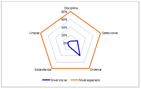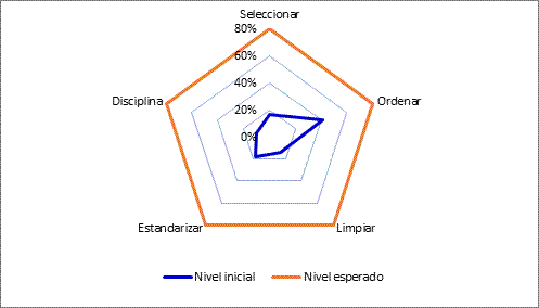 La evaluaci n inicial del rea de producci n evidenci un bajo nivel de cumplimiento de la metodolog a 5S, con un promedio de 18.6%, valor significativamente inferior al nivel esperado del 80% (Tabla 2). Las mayores brechas se observaron en las dimensiones Disciplina (8%) y Seleccionar (15%), lo que refleja una limitada estandarizaci n del puesto de trabajo y una alta variabilidad en la disposici n de herramientas y materiales (Figura 1).