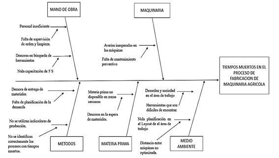 Con el fin de explicar el origen de los tiempos muertos identificados en la l nea base, se aplic un an lisis basado en el juicio de los trabajadores del rea de producci n, identific ndose ocho causas principales (Tabla 3). Estas causas fueron organizadas mediante un diagrama de Ishikawa (Figura 2) y posteriormente priorizadas utilizando el an lisis de Pareto (Tabla 4; Figura 3).