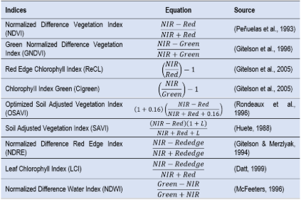 Vegetation indices are complementary tools that integrate geographic information systems to analyze crops based on the reflectance they emit (Quille-Mamani et al., 2022). These indices are generally used to assess biomass or crop health but are also employed in monitoring different phenological stages.