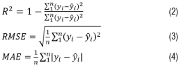 Several machine learning models were employed, including Linear Regression (LR), Support Vector Machine (SVM), Random Forest (RF), Elastic Net (EN), and Neural Networks (NN), with 5-fold cross-validation applied using the caret package (Kuhn, 2008). The model performance was evaluated using metrics such as the coefficient of determination (R²), root mean squared error (RMSE), and mean absolute error (MAE), as detailed in Equations 2, 3, and 4, respectively. In these Sequations, yi represents the observed value, and ŷi, indicates the predicted value, with 𝑛 indicating the number of samples. All analyses were performed using R version 4.4.1 (R Core Team, 2023).