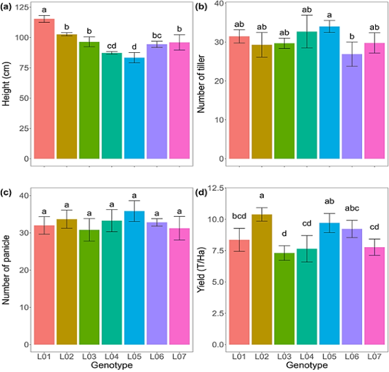 Figure 2. Barplot with Tukey post hoc analysis (p < 0.05) showing mean comparisons among rice genotypes. (a) Height, (b) Number of tillers, (c) Number of panicles, and (d) Yield. Letters above the bars indicate significant differences among genotypes.