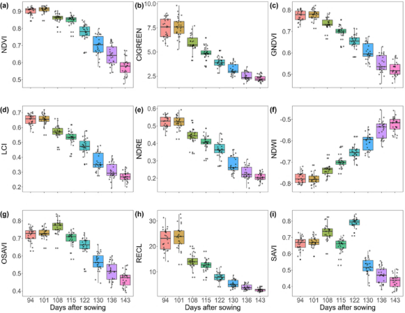 Figure 3. Behavior of vegetation indices at different evaluated days. (a) NDVI, (b) CIGREEN, (c) GNDVI, (d) LCI, (e) NDRE, (f) NDWI, (g) OSAVI, (h) RECL, and (i) SAVI estimated by multispectral images from UAV.