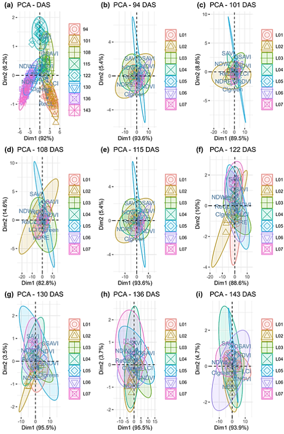 Figure 4. PCA of vegetation indices during the evaluation days: (a) PCA for all indices and days after sowing (DAS); PCA for the indices and groups of rice genotypes at (b) 94 DAS, (c) 101 DAS, (d) 108 DAS, (e) 115 DAS, (f) 122 DAS, (g) 130 DAS, (h) 136 DAS, and (i) 143 DAS.