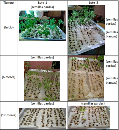 La germinación de cada lote se evalúo cada 2 meses, para 100 semillas pardas y 100 semillas blancas, subdivididas en 3 réplicas, una con 40 semillas y dos con 30. Las semillas blancas se evaluaron mientras hubo disponibilidad.