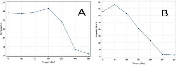 Las semillas pardas del lote 1 conservaron un elevado poder germinativo con más del 70% de germinación durante 180 días (6 meses), afectado posiblemente porque tenían 4 meses de cosechadas al comienzo del estudio. Esto indicó que el porcentaje de germinación fue bueno durante 10 meses, mientras que en el lote 2, el comportamiento de germinación fue bajo, con más de un 60% a los 60 días (2 meses). Éstas tenían 2 meses de cosechadas al inicio del estudio, por lo que se puede plantear que se mantuvo la viabilidad durante 4 meses de almacenamiento.