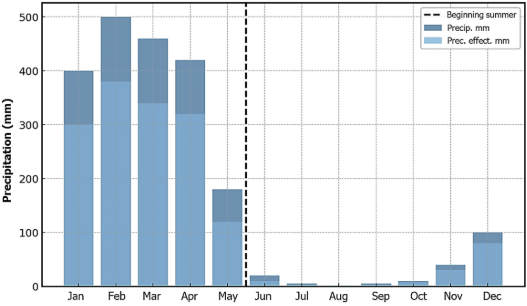 Figure 4. Monthly precipitation distribution and effective precipitation, showing total precipitation (Precip. mm) and effective precipitation (Effective precip. mm) throughout the year, with a dividing line marking the beginning of summer (June).