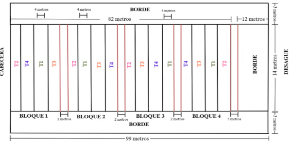 Cada unidad experimental estuvo conformada por 14 hileras de 4 m de longitud cada una (Figura 2).
