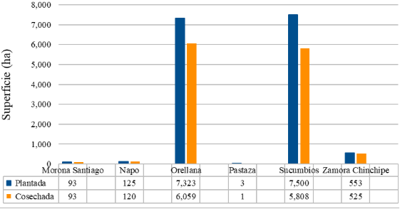Según el último censo agropecuario realizado por el Instituto Nacional de Estadística y Censos, INEC (2022), se identifican las siguientes superficies ha plantadas y cosechadas del café en la Figura 2 en la Región Amazónica. En las provincias de Morona Santiago y Napo las ha plantadas y cosechadas son comparativamente bajas con 93 y 120 respectivamente. Sin embargo, en Orellana y Sucumbíos las cifras son considerablemente más altas con 7.323 y 7.500 ha plantadas y 6.059 y 5.808 ha cosechadas, respectivamente. Pastaza presenta la menor cantidad con solo 3 ha plantadas y 1 ha cosechada. Zamora Chinchipe muestra una mayor eficiencia relativa entre lo plantado (553 ha) y lo cosechado (525 ha).