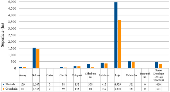 La Figura 3 muestran las superficies plantadas y cosechadas en varias provincias de la región Sierra o Andina de Ecuador. Azuay tiene 109 ha plantadas y 92 cosechadas. Bolívar reporta una significativa actividad agrícola con 1.547 ha plantadas y 1.435 cosechadas. Cañar y Tungurahua no reportan ninguna actividad de plantación o cosecha. Carchi, Cotopaxi y Chimborazo tienen menores cantidades con Carchi plantando 98 y cosechando 59 ha, Cotopaxi con 152 plantadas y 146 cosechadas y Chimborazo con 308 plantadas, pero solo 60 cosechadas indicando una posible ineficiencia o desafío en la producción. Imbabura y Pichincha tienen una producción considerable con 415 y 521 ha plantadas y 359 y 461 cosechadas, respectivamente. Loja destaca como la provincia con la mayor cantidad de terreno destinado al cultivo con 4.959 ha plantadas y 3.630 cosechadas. Finalmente, Santo Domingo de los Tsáchilas muestra 460 ha plantadas frente a 321 cosechadas.