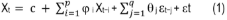 Donde Xt: variable de la serie observada en el tiempo t (como la TSM o el precio de la harina de pescado); c: intercepto o constante que repre-senta la tendencia central de la serie; p: orden del componente autoregresivo (AR), es decir, valores pasados de la serie que afectan al valor presente; i: coeficiente del componente autorregresivo, determinan la influencia de los valores pasados, Xt−i; q: orden del componente de media móvil (MA), que indica cuántos errores pasados afectan al valor presente; Xt−i: valores pasados de la serie, que influyen en el valor actual Xt; j: coeficientes del componente de media móvil, miden la influencia de los errores pasados t−j sobre Xt; t: error aleatorio en el tiempo (t) y t−j: errores pasados, que afectan al valor presente a través del componente de media móvil.
