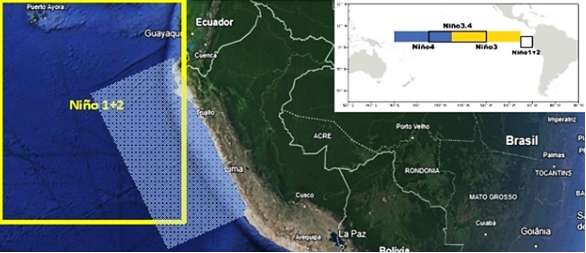 La TSM del área Niño 1+2 (°C), definida por el Centro de Predicción Climática de la Adminis-tración del Océano y la Atmósfera de los Estados Unidos de América – CPC NOAA (Climate Prediction Center - Four El Niño Regions, 2023), es expresada en un área entre 0 a 10° sur y entre 80 a 90° oeste. Esta región cubre el área marina frente a la costa sur de Ecuador y norte de Perú.