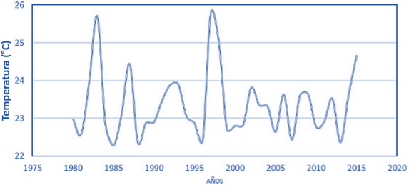 En la costa sur de Ecuador, Perú y norte de Chile se presentan afloramientos marinos, que provo-can el ascenso de aguas profundas frías y nutrientes hacia la superficie cambiando la dinámica de la temperatura del Pacífico suroriental (Montecinos & Aceituno, 2003; Arntz et al., 2006). Esta productividad biológica sustenta la pesquería de pelágicos pequeños, más impor-tantes del mundo, contribuyendo a la biodiver-sidad marina en la región (Chavez & Messié, 2009). La ocurrencia de El Niño debilita los aflora-mientos favoreciendo las condiciones cálidas.
