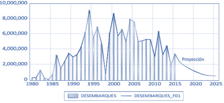 Respecto a la serie de desembarques, se registró tendencias lineales, que se pueden reflejar en los correlogramas de AC y ACP, que comprueba la no estacionariedad. Se aplicó la primera diferen-cia, obteniéndose una serie residual estacionaria (DDesembarques), lo cual se demostró mediante el test DFA con un p < 0,001, confirmado por el test Phillips-Perron (p < 0,001). Los resultados presentaron un R2 = 0,695952, estadísticamente significativo. Luego, se realizaron 20 interaccio-nes para obtener el mejor modelo para la serie de desembarques, generándose un modelo ARMA (2,3) con el AIC = 31,915 y coeficiente de Durbin Watson de 2,006 que expresó la no existencia de autocorrelación entre los residuos, y en conse-cuencia el error está constituido por ruido blanco. Por su parte, el R2 = 0,617 fue significativo. Final-mente, se realizó un pronóstico de 10 períodos, generándose la serie Desembaques_F01, mos-trando un descenso sostenido de la producción, sin embargo, no expresa el período de recupe-ración asociado a La Niña 2020-2022. Se estima que el modelo está expresando datos razonables durante los tres primeros años.