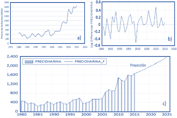 Figura 7. Precio de la harina de pescado (USD/TM): a) Evolución histórica de 1980 a 2015; b) Serie residual del precio internacional; c) Pronóstico del precio promedio.