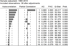 Posteriormente, se generó correlogramas de las funciones de autocorrelación (AC) y de autocorrelación parcial (ACP) a fin de explorar el número de medias móviles y autoregresivos, respectivamente. Se aplicó el ARMA (Modelo Autoregresivo de media móvil) para modelar las series. Bajo el concepto de parsimonia, es conveniente emplear modelos mediante la representación del proceso lineal de un pequeño número de términos autorregresivos y de media móvil (Box et al., 1994). Adicionalmente, se realizaron proyecciones a diez años en base a la aplicación de los modelos de las distintas series, una vez que se identificó que las series de residuos constituía ruido blanco.