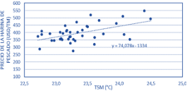 Figura 8. Regresión de la TSM y el precio de la harina de pescado.