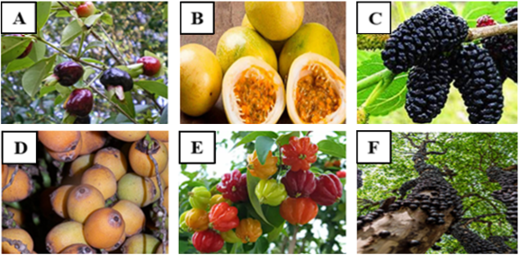 Figure 1. Black cerella (A), passion fruit (B); black mulberry (C), pindó fruit (D), pitanga (E), jabuticaba (F).