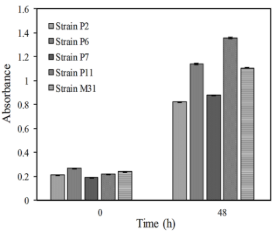 Figure 2 shows the growth results of P2, P6, P7, M31 strains and the reference strain in the presence of sucrose (50 g/L) as the sole carbon and energy source (CES).