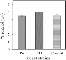 The results of the alcoholic fermentations of the selected yeast strains and those of the commercial strain, in a semi-synthetic medium with 100 g/L of glucose, are shown in Figure 3. The ethanol produced by P6 and control strains was 4.5% (v/v) and the ethanol yield was 0.355 gethanol/gglucose (69.6% theoretical yield). Whereas strain P11 produced 5% (v/v) ethanol and a yield of 0.3945 gethanol/gglucose (77% theoretical yield). Ortiz-Zamora et al (2009), reported that yeast strains isolated from natural sources in Veracruz (México) showed a maximum yield of 0.46 gethanol/gglucose (90% theoretical yield).
