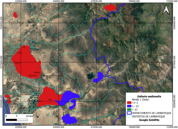 Figura 3. Distribución espacial de Galleria mellonella. / Figure 3. Spatial distribution of Galleria mellonella.