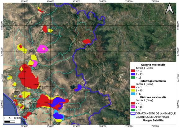Finalmente, para Galleria mellonella (Figura 3), el parasitismo fue predominantemente bajo (≤1%) en la mayoría de los distritos, incluyendo Ferreñafe, Pueblo Nuevo y el valle de La Leche. Sin embargo, se identificaron áreas de parasi-tismo intermedio (1% – 13%) en los distritos de Pítipo, Cañaris y Pucalá, donde se hipotetiza una posible coincidencia de microhábitats favorables o menor perturbación antrópica. No se detectaron zonas con parasitismo superior a 13%, lo cual es coherente con el rol limitado de Galleria como hospedero natural en ambientes agrícolas abiertos.