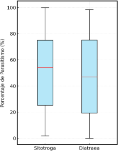 El diagrama de caja representa el porcentaje de parasitismo por Trichogramma spp. en dos especies hospedadoras: Sitotroga y Diatraea. En ambas se observa una distribución amplia, con valores que oscilan desde casi 0% hasta niveles cercanos al 100%, lo que indica una alta variabilidad en la eficacia del parasitismo. La mediana fue ligeramente mayor en Sitotroga (≈54%) que en Diatraea (≈47%), sugiriendo una respuesta algo más favorable del parasitoide hacia Sitotroga. Los rangos intercuartílicos también fueron amplios, reflejando la influencia de factores ecológicos o de manejo que podrían estar modulando la efectividad del control biológico en campo.