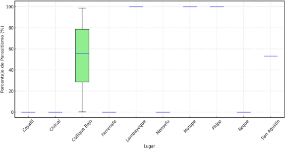 Los diagramas de caja generados muestran la distribución del porcentaje de parasitismo (Figura 5), representando el parasitismo por especie hospedadora, donde Sitotroga exhibe una mayor variabilidad (mediana = 50%, IQR = 0–100%) en comparación con Diatraea (mediana = 0%, IQR = 0–100%). La Figura 6 muestra el parasitismo por lugar, destacando que Lambayeque, Motupe, Pítipo, Salas y Collique Bajo tienen valores altos (100%), mientras que Cayaltí, Chilcal, Ferreñafe, Monsefú y Reque registran 0%. San Agustín presenta un valor intermedio (53,12%).