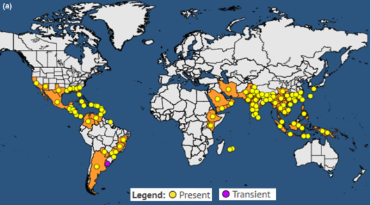 Figure 1. Distribution of (a) Candidatus Liberibacter asiaticus, (b) Candidatus Liberibacter americanus, and (c) Candidatus Liberibacter africanus. Source: EPPO (2025).
