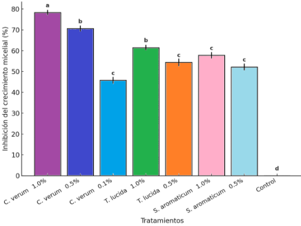 Los resultados mostraron que el aceite esencial de canela alcanzó los valores más altos de inhibición, seguido por los de T. lucida y S. aromaticum. En la Figura 2 se muestran los porcentajes promedio de inhibición para cada aceite y concentración, en donde se puede apreciar que el aceite de canela registró el mayor valor con 78,3% de inhibición al 1,0%, seguido del aceite de T. lucida con 61,5% y del aceite de clavo con 57,8%. En concentraciones inferiores a 0,1%, los efectos antifúngicos no fueron significativa-mente diferentes del control.