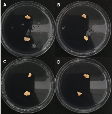Figura 3. Efecto del tratamiento en callos embriogénicos de aguacate con extractos vegetales: Control (A); T. lucida 1% (B); C. verum (C); S. aromaticum (D). Tiempo de aplicación: 15 días.