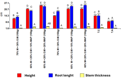 Figures 1 and 2 show the values of the biometric variables. In general, greater height, stem length, basal stem thickness, stem and root dry weight were obtained in plants applied with the formula-tion of 60% M. pruriens + 20% Organo-minerals + 20% MAP, both at 100 g/plant and at 150 g/plant, the above in relation to the commercial (T.C) and absolute control (T.A) (p < 0.05).