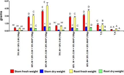60% Muc. + 20% O.M + 20% MAP (150g/pl) | 5.8 e | 0.38 e | 1.3 d | 0.31 d | 1.9 a | 0.23 b | 96 a | 1 a | 15.3 ab | 774 d | 16 a |