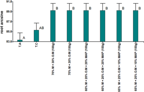 60% Muc. + 20% O.M + 20% MAP (150 g/pl) | 6.5 ab | 4.1 bc | 2.1 c |