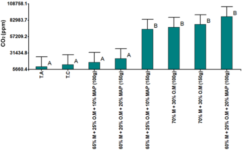 Each plant was measured for microbial respiration by ppm of CO2 taking a sample of soil from the first 10 cm of depth of each one. A portable infrared gas analyzer (IRGA) camera with a range between 0 - 10000 ppm (IRGA, LI-COR® Biosciences) was used. The CO2 concentration was quantified every 4 seconds for a period of 24 hours at an average temperature of 20 °C. It was done in the dark to prevent light from interfering with the measu-rement.