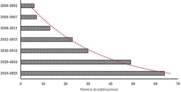 Figura 1. Artículos científicos originales publicados por períodos entre los años 2000 y 2025. Fuente: Scopus).