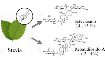 Uno de los principales edulcorantes es la Stevia rebaudiana, una planta ampliamente utilizada como fuente de edulcorantes naturales sin calorías (Jahangir et al., 2020). Sus compuestos activos principales son los glucósidos de esteviol, entre los que destacan el esteviósido y el rebaudiósido A, responsables del sabor dulce característico de la planta. Estos compuestos son diterpenos glicosilados que se encuentran en distintas proporciones en las hojas de stevia, siendo el esteviósido el más abundante (4% –13%) y el rebaudiósido A (2% – 4%) el más dulce y deseado por su mejor perfil sensorial (Jahangir et al., 2020) (Figura 6).