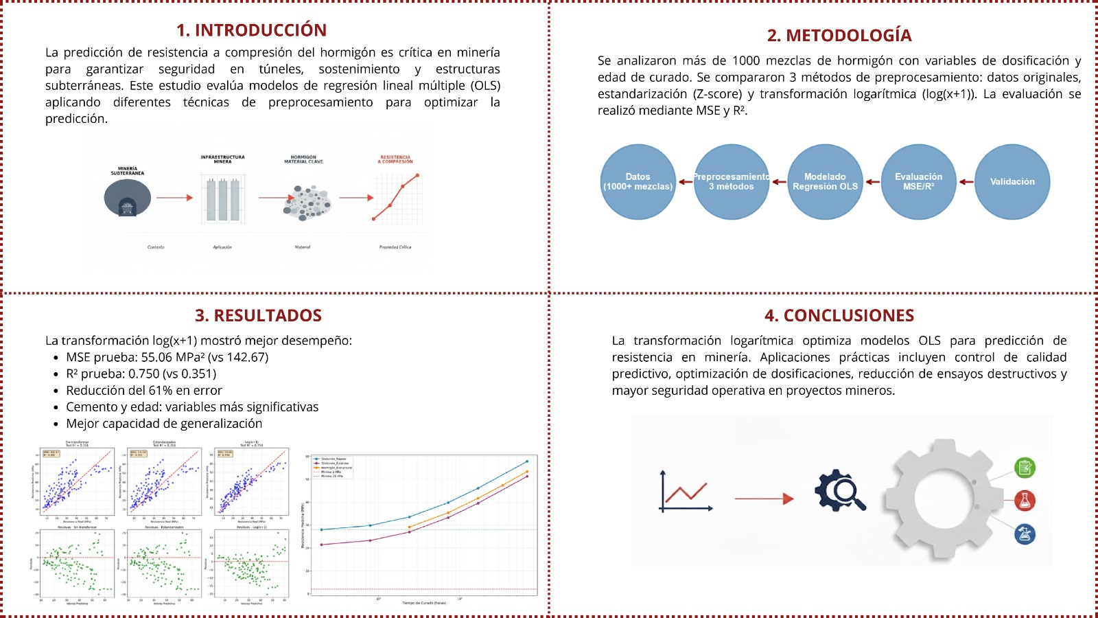 La seguridad y estabilidad de los sistemas de soporte y revestimiento constituyen un aspecto crítico en los proyectos de ingeniería minera, debido a las altas exigencias estructurales impuestas por las condiciones operativas, especialmente en minería subterránea. El objetivo principal de este estudio fue evaluar la capacidad de modelos de regresión lineal múltiple (OLS) para predecir la resistencia a la compresión del hormigón, analizando el efecto de diferentes técnicas de preprocesamiento de datos sobre su desempeño predictivo. La metodología adoptó un enfoque cuantitativo y se basó en el análisis de un conjunto de datos experimentales compuesto por más de 1000 mezclas de hormigón, considerando variables asociadas a la dosificación de los materiales y a la edad de curado. Se desarrollaron y compararon tres configuraciones de modelado: predictores sin transformación, predictores estandarizados y predictores transformados mediante la función log(x+1). El desempeño de los modelos se evaluó utilizando el Error Cuadrático Medio (MSE) y el coeficiente de determinación R². Los resultados obtenidos muestran que los modelos construidos con datos originales y estandarizados presentaron un comportamiento similar, con valores de R² cercanos a 0.351 en el conjunto de prueba. En contraste, la transformación logarítmica permitió reducir el MSE de prueba a aproximadamente 55 MPa² e incrementar el R² hasta valores próximos a 0.750, evidenciando una mejora sustancial en la precisión y capacidad de generalización del modelo. El alcance de estos resultados se orienta al uso del modelo como una herramienta predictiva de apoyo de control de calidad del hormigón en aplicaciones mineras. En conclusión, la regresión lineal múltiple combinada con un preprocesamiento adecuado mediante transformación logarítmica constituye una alternativa eficiente y confiable para la estimación de la resistencia a la compresión del hormigón, manteniendo una interpretación clara de los resultados y aportando soporte practico para la toma de decisiones técnicas en minería.