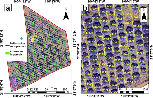 En este inventario se incluyeron los espacios en donde actualmente no hay árboles debido a que fueron cortados por el productor o se cayeron por enfermedad, ya que esos árboles son reemplazados constantemente. Cada árbol y espacio sin árbol se etiquetó con una clave de identificación compuesta por número de columna y número árbol generando 677 etiquetas, en la Figura 1b se realizó un acercamiento al inventario para apreciar de mejor manera la clave por árbol.