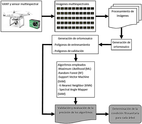 Este trabajo se desarrolló en ocho etapas (Figura 2): (1) adquisición y preprocesamiento de datos de imágenes multiespectrales, (2) generación del ortomosaico, (3) diseño del esquema de clasificación de la cobertura terrestre y selección de áreas de entrenamiento, (4) separación aleatoria de polígonos de entrenamiento y validación (5) selección y configuración de algoritmos, (6) clasificación de ortomosaico, (7) validación y evaluación de la precisión de los algoritmos y (8) determinación de la condición fitosanitaria por algoritmo para cada árbol.
