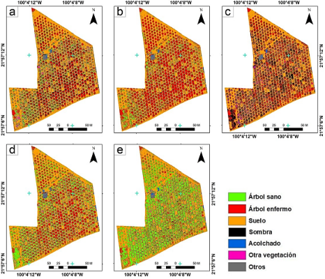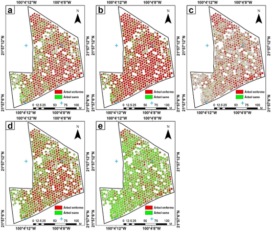 El objetivo de este trabajo fue identificar árboles de naranja enfermos en un huerto ubicado en el Valle de Rioverde, San Luis Potosí, México, utilizando datos de alta resolución espacial recopilados mediante vuelos de vehículos aéreos no tripulados (UAV, por sus siglas en inglés). Para ello, se evaluó el desempeño de cinco algoritmos de aprendizaje automático los cuales incluyen Random Forest, K-Nearest Neighbor, Spectral Angle Mapper, Support Vector Machine y Maximum Likelihood.