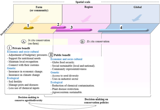 This approach facilitates the linkages between in situ and ex situ conservation methods, thus promoting participatory manage-ment of PGRs. Then, this approach was associated to the analysis of benefits (public and private) of in situ conservation to illustrate the net benefits for custodian farmers who decide to provide the conservation service of local breeds and wild crops. Finally, the opportunity costs by the farmers in conserving agrobiodiversity was reviewed, which is related to the approaches of their WTA compensation and participation in providing con-servation service, thus revealing the opportunity costs to the farmers. This review focuses on published literature about farmer incentive tools based on stated preference methods. To achieve this objective, the SPIDER tool was used (Methley et al., 2014) to identify studies that focus on the WTA compensation of farmers who provide the service of plant genetic resources conservation, which incorporates the benefits.
