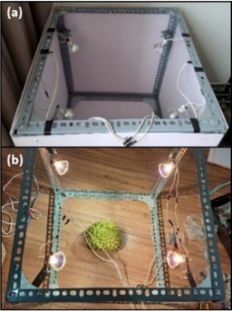 After 1 day, the durian samples will be put into the sampling box. The sampling chamber is a 50×50×50cm cube box which has rough white wall. The four upper corners of the box are arranged with the 50W halogen lights. The bulls are arranged at 45° angle from the vertical and pointing down toward the center of the chamber (Figure 7a, 7b).