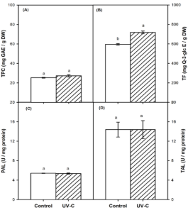 In the present study, similar patterns were observed, where UV-C radiation treatment enhanced total phenolic content (TPC), and particularly total flavonoid content (TF), despite no significant changes in the activity of phenylalanine ammonia-lyase (PAL) and tyrosine ammonia-lyase (TAL). Comparable results were reported by Zhu et al. (2020) in germinated peanut seeds (48 h of germination) treated with UV-C radiation (180 µW/cm² for 8 h/day over 8 days). These authors found that PAL and TAL activities increased significantly four days after treatment but subsequently declined, returning to control levels by the time of harvest.