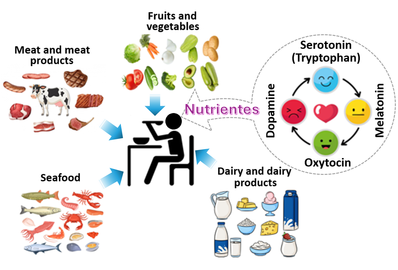 This review is scientific research that seeks to explore the relationship between the consumption of certain foods and the emotional state, determining the effects that these foods produce when consumed by individuals. The intake of specific foods containing certain functional properties may help enhance our emotional health. There are particular nutrients present in certain foods that play an important role in overall health, especially in brain function. The objective of this review study was to highlight double-blind studies in humans that demonstrate the effectiveness of nutrients present in foods that interact with neurotransmitters (melatonin, endorphins, serotonin, dopamine, and oxytocin), which affect people's mood and well-being. For this study, specialized journals and scientific articles published in the last five years were selected. The results show that there is a wide variety of foods that contribute to people's well-being when consumed, and that this is not exclusive to a particular group of foods. Thus, meat products, dairy products, fruits, vegetables, and seafood, among others, contain nutrients with functional properties associated with people's emotional state. Finally, future studies should incorporate other variables such as ethnic groups, race, age, and body type, which may affect the results obtained.