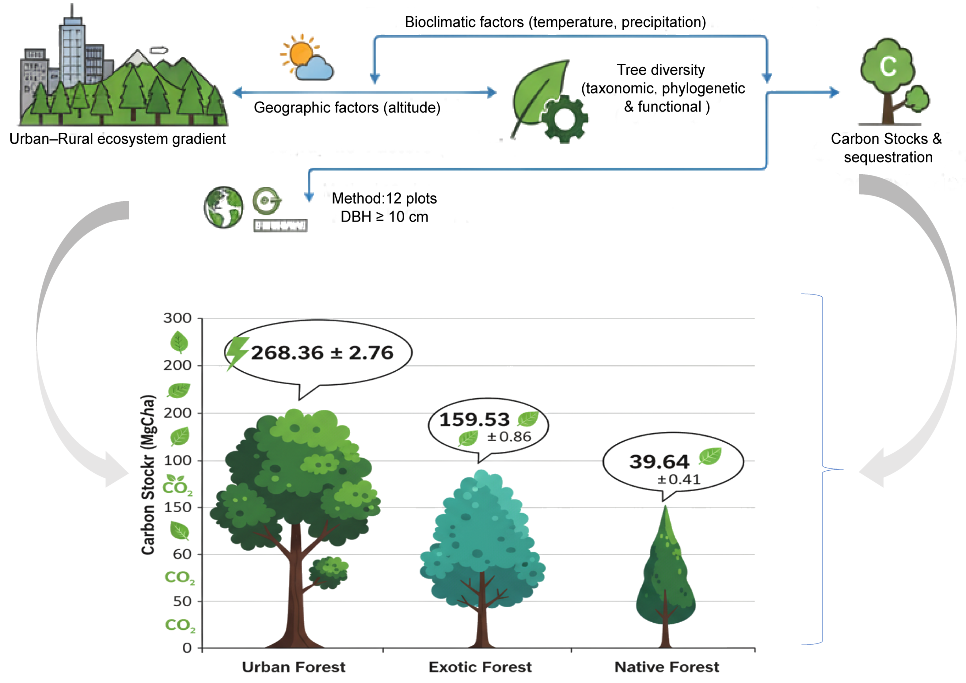 Contribution of trees to carbon stocks in urban–rural ecosystems: Taxonomic, phylogenetic, and functional diversity in response to bioclimatic and geographic factors